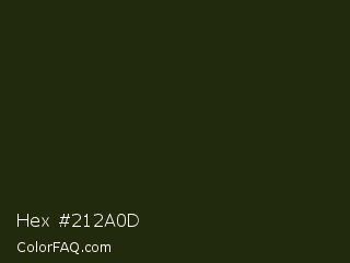 Hex #212a0d Color is a very dark lime color and the nearest color is Seaweed #1b2f11. Hex code #212a0d and RGB value is rgb(33,42,13). In RGB color space, this color is composed of 13% red, 16% green, 5% blue, In CMYK color space, this color is composed of 21% cyan, 0% magenta, 69% yellow , 84% black , In HSL color space, this color has a hue angle of 79° , 53% saturation and 11% lightness.