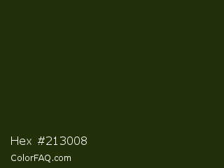 Hex #213008 Color is a very dark green color and the nearest color is Deep Forest Green #182d09. Hex code #213008 and RGB value is rgb(33,48,8). In RGB color space, this color is composed of 13% red, 19% green, 3% blue, In CMYK color space, this color is composed of 31% cyan, 0% magenta, 83% yellow , 81% black , In HSL color space, this color has a hue angle of 83° , 71% saturation and 11% lightness.