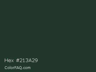 Hex #213a29 Color is a very dark green color and the nearest color is Black Leather Jacket #253529. Hex code #213a29 and RGB value is rgb(33,58,41). In RGB color space, this color is composed of 13% red, 23% green, 16% blue, In CMYK color space, this color is composed of 43% cyan, 0% magenta, 29% yellow , 77% black , In HSL color space, this color has a hue angle of 139° , 27% saturation and 18% lightness.