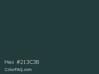 Hex #213c3b Color is a very dark cyan color and the nearest color is Te Papa Green #1e433c. Hex code #213c3b and RGB value is rgb(33,60,59). In RGB color space, this color is composed of 13% red, 24% green, 23% blue, In CMYK color space, this color is composed of 45% cyan, 0% magenta, 2% yellow , 76% black , In HSL color space, this color has a hue angle of 178° , 29% saturation and 18% lightness.