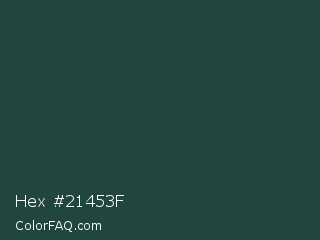 Hex #21453f Color is a very dark cyan color and the nearest color is Te Papa Green #1e433c. Hex code #21453f and RGB value is rgb(33,69,63). In RGB color space, this color is composed of 13% red, 27% green, 25% blue, In CMYK color space, this color is composed of 52% cyan, 0% magenta, 9% yellow , 73% black , In HSL color space, this color has a hue angle of 170° , 35% saturation and 20% lightness.