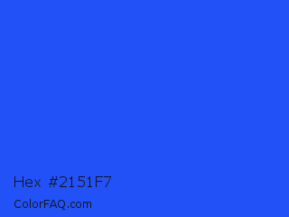 Hex #2151f7 Color is a normal blue color and the nearest color is Palatinate Blue #273be2. Hex code #2151f7 and RGB value is rgb(33,81,247). In RGB color space, this color is composed of 13% red, 32% green, 97% blue, In CMYK color space, this color is composed of 87% cyan, 67% magenta, 0% yellow , 3% black , In HSL color space, this color has a hue angle of 227° , 93% saturation and 55% lightness.