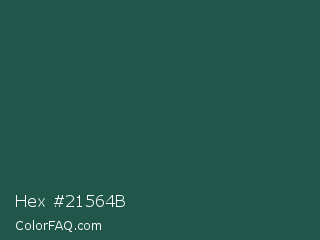 Hex #21564b Color is a dark cyan color and the nearest color is Plantation #27504b. Hex code #21564b and RGB value is rgb(33,86,75). In RGB color space, this color is composed of 13% red, 34% green, 29% blue, In CMYK color space, this color is composed of 62% cyan, 0% magenta, 13% yellow , 66% black , In HSL color space, this color has a hue angle of 168° , 45% saturation and 23% lightness.