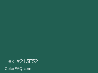 Hex #215f52 Color is a dark cyan color and the nearest color is Spectra #2f5a57. Hex code #215f52 and RGB value is rgb(33,95,82). In RGB color space, this color is composed of 13% red, 37% green, 32% blue, In CMYK color space, this color is composed of 65% cyan, 0% magenta, 14% yellow , 63% black , In HSL color space, this color has a hue angle of 167° , 48% saturation and 25% lightness.