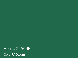 Hex #21694b Color is a dark green color and the nearest color is Green Pea #1d6142. Hex code #21694b and RGB value is rgb(33,105,75). In RGB color space, this color is composed of 13% red, 41% green, 29% blue, In CMYK color space, this color is composed of 69% cyan, 0% magenta, 29% yellow , 59% black , In HSL color space, this color has a hue angle of 155° , 52% saturation and 27% lightness.