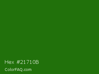 Hex #21710b Color is a dark green color and the nearest color is Napier Green #2a8000. Hex code #21710b and RGB value is rgb(33,113,11). In RGB color space, this color is composed of 13% red, 44% green, 4% blue, In CMYK color space, this color is composed of 71% cyan, 0% magenta, 90% yellow , 56% black , In HSL color space, this color has a hue angle of 107° , 82% saturation and 24% lightness.