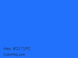 Hex #2171fc Color is a normal blue color and the nearest color is Blue Crayola #1f75fe. Hex code #2171fc and RGB value is rgb(33,113,252). In RGB color space, this color is composed of 13% red, 44% green, 99% blue, In CMYK color space, this color is composed of 87% cyan, 55% magenta, 0% yellow , 1% black , In HSL color space, this color has a hue angle of 218° , 97% saturation and 56% lightness.