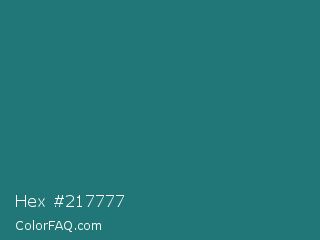 Hex #217777 Color is a dark cyan color and the nearest color is Elm #1c7c7d. Hex code #217777 and RGB value is rgb(33,119,119). In RGB color space, this color is composed of 13% red, 47% green, 47% blue, In CMYK color space, this color is composed of 72% cyan, 0% magenta, 0% yellow , 53% black , In HSL color space, this color has a hue angle of 180° , 57% saturation and 30% lightness.