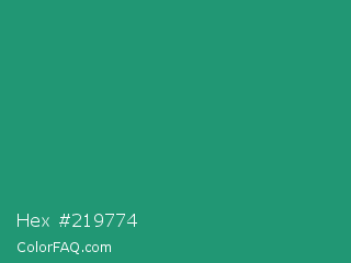 Hex #219774 Color is a normal green color and the nearest color is Illuminating Emerald #319177. Hex code #219774 and RGB value is rgb(33,151,116). In RGB color space, this color is composed of 13% red, 59% green, 45% blue, In CMYK color space, this color is composed of 78% cyan, 0% magenta, 23% yellow , 41% black , In HSL color space, this color has a hue angle of 162° , 64% saturation and 36% lightness.