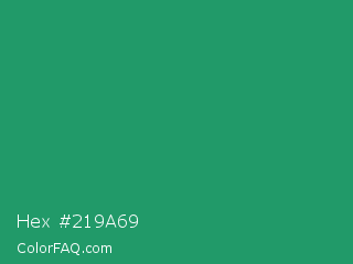 Hex #219a69 Color is a normal green color and the nearest color is Eucalyptus #278a5b. Hex code #219a69 and RGB value is rgb(33,154,105). In RGB color space, this color is composed of 13% red, 60% green, 41% blue, In CMYK color space, this color is composed of 79% cyan, 0% magenta, 32% yellow , 40% black , In HSL color space, this color has a hue angle of 156° , 65% saturation and 37% lightness.