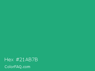 Hex #21ab7b Color is a normal green color and the nearest color is Green Crayola #1cac78. Hex code #21ab7b and RGB value is rgb(33,171,123). In RGB color space, this color is composed of 13% red, 67% green, 48% blue, In CMYK color space, this color is composed of 81% cyan, 0% magenta, 28% yellow , 33% black , In HSL color space, this color has a hue angle of 159° , 68% saturation and 40% lightness.
