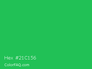Hex #21c156 Color is a normal green color and the nearest color is Malachite #0bda51. Hex code #21c156 and RGB value is rgb(33,193,86). In RGB color space, this color is composed of 13% red, 76% green, 34% blue, In CMYK color space, this color is composed of 83% cyan, 0% magenta, 55% yellow , 24% black , In HSL color space, this color has a hue angle of 140° , 71% saturation and 44% lightness.