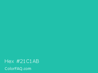 Hex #21c1ab Color is a normal cyan color and the nearest color is Light Sea Green #20b2aa. Hex code #21c1ab and RGB value is rgb(33,193,171). In RGB color space, this color is composed of 13% red, 76% green, 67% blue, In CMYK color space, this color is composed of 83% cyan, 0% magenta, 11% yellow , 24% black , In HSL color space, this color has a hue angle of 172° , 71% saturation and 44% lightness.