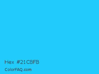 Hex #21cbfb Color is a normal cyan color and the nearest color is Spiro Disco Ball #0fc0fc. Hex code #21cbfb and RGB value is rgb(33,203,251). In RGB color space, this color is composed of 13% red, 80% green, 98% blue, In CMYK color space, this color is composed of 87% cyan, 19% magenta, 0% yellow , 2% black , In HSL color space, this color has a hue angle of 193° , 96% saturation and 56% lightness.