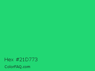 Hex #21d773 Color is a normal green color and the nearest color is UFO Green #3cd070. Hex code #21d773 and RGB value is rgb(33,215,115). In RGB color space, this color is composed of 13% red, 84% green, 45% blue, In CMYK color space, this color is composed of 85% cyan, 0% magenta, 47% yellow , 16% black , In HSL color space, this color has a hue angle of 147° , 73% saturation and 49% lightness.