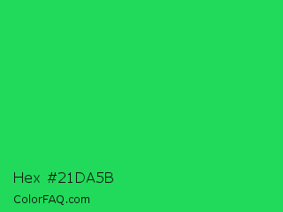 Hex #21da5b Color is a normal green color and the nearest color is Malachite #0bda51. Hex code #21da5b and RGB value is rgb(33,218,91). In RGB color space, this color is composed of 13% red, 85% green, 36% blue, In CMYK color space, this color is composed of 85% cyan, 0% magenta, 58% yellow , 15% black , In HSL color space, this color has a hue angle of 139° , 74% saturation and 49% lightness.