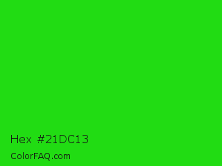Hex #21dc13 Color is a normal green color and the nearest color is Lime Green #32cd32. Hex code #21dc13 and RGB value is rgb(33,220,19). In RGB color space, this color is composed of 13% red, 86% green, 7% blue, In CMYK color space, this color is composed of 85% cyan, 0% magenta, 91% yellow , 14% black , In HSL color space, this color has a hue angle of 116° , 84% saturation and 47% lightness.
