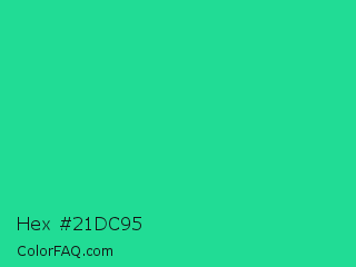 Hex #21dc95 Color is a normal green color and the nearest color is Shamrock #33cc99. Hex code #21dc95 and RGB value is rgb(33,220,149). In RGB color space, this color is composed of 13% red, 86% green, 58% blue, In CMYK color space, this color is composed of 85% cyan, 0% magenta, 32% yellow , 14% black , In HSL color space, this color has a hue angle of 157° , 74% saturation and 50% lightness.