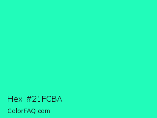 Hex #21fcba Color is a normal green color and the nearest color is Turquoise PWG #30d5c8. Hex code #21fcba and RGB value is rgb(33,252,186). In RGB color space, this color is composed of 13% red, 99% green, 73% blue, In CMYK color space, this color is composed of 87% cyan, 0% magenta, 26% yellow , 1% black , In HSL color space, this color has a hue angle of 162° , 97% saturation and 56% lightness.