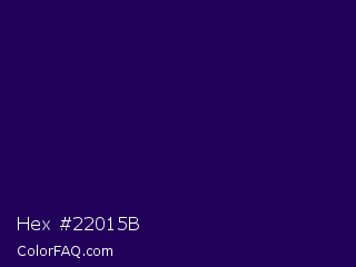 Hex #22015b Color is a very dark violet color and the nearest color is Cherry Pie #2a0359. Hex code #22015b and RGB value is rgb(34,1,91). In RGB color space, this color is composed of 13% red, 0% green, 36% blue, In CMYK color space, this color is composed of 63% cyan, 99% magenta, 0% yellow , 64% black , In HSL color space, this color has a hue angle of 262° , 98% saturation and 18% lightness.