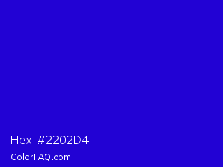 Hex #2202d4 Color is a normal indigo color and the nearest color is Interdimensional Blue #360ccc. Hex code #2202d4 and RGB value is rgb(34,2,212). In RGB color space, this color is composed of 13% red, 1% green, 83% blue, In CMYK color space, this color is composed of 84% cyan, 99% magenta, 0% yellow , 17% black , In HSL color space, this color has a hue angle of 249° , 98% saturation and 42% lightness.