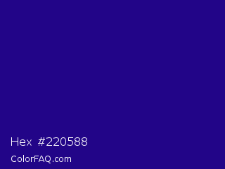 Hex #220588 Color is a dark indigo color and the nearest color is Blue Gem #2c0e8c. Hex code #220588 and RGB value is rgb(34,5,136). In RGB color space, this color is composed of 13% red, 2% green, 53% blue, In CMYK color space, this color is composed of 75% cyan, 96% magenta, 0% yellow , 47% black , In HSL color space, this color has a hue angle of 253° , 93% saturation and 28% lightness.