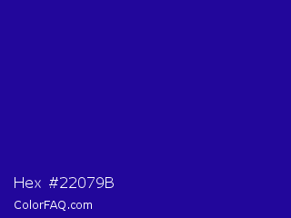 Hex #22079b Color is a normal indigo color and the nearest color is Blue Gem #2c0e8c. Hex code #22079b and RGB value is rgb(34,7,155). In RGB color space, this color is composed of 13% red, 3% green, 61% blue, In CMYK color space, this color is composed of 78% cyan, 95% magenta, 0% yellow , 39% black , In HSL color space, this color has a hue angle of 251° , 91% saturation and 32% lightness.