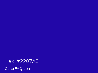 Hex #2207a8 Color is a normal indigo color and the nearest color is Ultramarine #120a8f. Hex code #2207a8 and RGB value is rgb(34,7,168). In RGB color space, this color is composed of 13% red, 3% green, 66% blue, In CMYK color space, this color is composed of 80% cyan, 96% magenta, 0% yellow , 34% black , In HSL color space, this color has a hue angle of 250° , 92% saturation and 34% lightness.