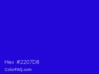 Hex #2207d8 Color is a normal indigo color and the nearest color is Interdimensional Blue #360ccc. Hex code #2207d8 and RGB value is rgb(34,7,216). In RGB color space, this color is composed of 13% red, 3% green, 85% blue, In CMYK color space, this color is composed of 84% cyan, 97% magenta, 0% yellow , 15% black , In HSL color space, this color has a hue angle of 248° , 94% saturation and 44% lightness.