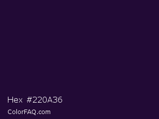 Hex #220a36 Color is a very dark purple color and the nearest color is Haiti #1b1035. Hex code #220a36 and RGB value is rgb(34,10,54). In RGB color space, this color is composed of 13% red, 4% green, 21% blue, In CMYK color space, this color is composed of 37% cyan, 81% magenta, 0% yellow , 79% black , In HSL color space, this color has a hue angle of 273° , 69% saturation and 13% lightness.
