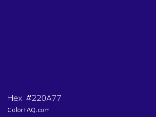 Hex #220a77 Color is a dark indigo color and the nearest color is Deep Blue #220878. Hex code #220a77 and RGB value is rgb(34,10,119). In RGB color space, this color is composed of 13% red, 4% green, 47% blue, In CMYK color space, this color is composed of 71% cyan, 92% magenta, 0% yellow , 53% black , In HSL color space, this color has a hue angle of 253° , 84% saturation and 25% lightness.