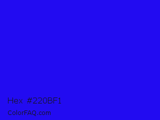 Hex #220bf1 Color is a normal indigo color and the nearest color is Bluebonnet #1c1cf0. Hex code #220bf1 and RGB value is rgb(34,11,241). In RGB color space, this color is composed of 13% red, 4% green, 95% blue, In CMYK color space, this color is composed of 86% cyan, 95% magenta, 0% yellow , 5% black , In HSL color space, this color has a hue angle of 246° , 91% saturation and 49% lightness.