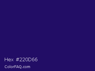 Hex #220d66 Color is a dark indigo color and the nearest color is Paris M #26056a. Hex code #220d66 and RGB value is rgb(34,13,102). In RGB color space, this color is composed of 13% red, 5% green, 40% blue, In CMYK color space, this color is composed of 67% cyan, 87% magenta, 0% yellow , 60% black , In HSL color space, this color has a hue angle of 254° , 77% saturation and 23% lightness.