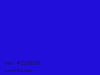 Hex #220edb Color is a normal indigo color and the nearest color is Interdimensional Blue #360ccc. Hex code #220edb and RGB value is rgb(34,14,219). In RGB color space, this color is composed of 13% red, 5% green, 86% blue, In CMYK color space, this color is composed of 84% cyan, 94% magenta, 0% yellow , 14% black , In HSL color space, this color has a hue angle of 246° , 88% saturation and 46% lightness.