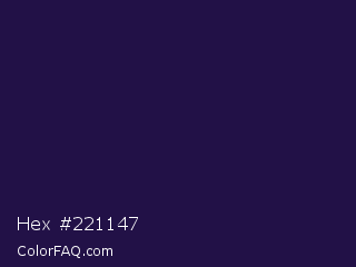 Hex #221147 Color is a very dark indigo color and the nearest color is Violet #240a40. Hex code #221147 and RGB value is rgb(34,17,71). In RGB color space, this color is composed of 13% red, 7% green, 28% blue, In CMYK color space, this color is composed of 52% cyan, 76% magenta, 0% yellow , 72% black , In HSL color space, this color has a hue angle of 259° , 61% saturation and 17% lightness.