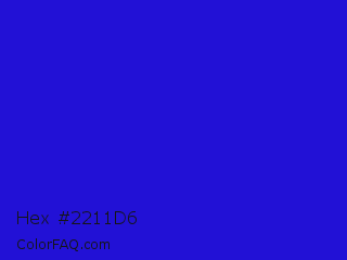 Hex #2211d6 Color is a normal indigo color and the nearest color is Interdimensional Blue #360ccc. Hex code #2211d6 and RGB value is rgb(34,17,214). In RGB color space, this color is composed of 13% red, 7% green, 84% blue, In CMYK color space, this color is composed of 84% cyan, 92% magenta, 0% yellow , 16% black , In HSL color space, this color has a hue angle of 245° , 85% saturation and 45% lightness.