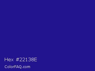 Hex #22138e Color is a normal indigo color and the nearest color is Blue Gem #2c0e8c. Hex code #22138e and RGB value is rgb(34,19,142). In RGB color space, this color is composed of 13% red, 7% green, 56% blue, In CMYK color space, this color is composed of 76% cyan, 87% magenta, 0% yellow , 44% black , In HSL color space, this color has a hue angle of 247° , 76% saturation and 32% lightness.