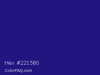 Hex #221580 Color is a dark indigo color and the nearest color is Deep Koamaru #1b127b. Hex code #221580 and RGB value is rgb(34,21,128). In RGB color space, this color is composed of 13% red, 8% green, 50% blue, In CMYK color space, this color is composed of 73% cyan, 84% magenta, 0% yellow , 50% black , In HSL color space, this color has a hue angle of 247° , 72% saturation and 29% lightness.