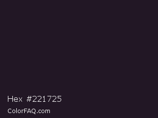 Hex #221725 Color is a very dark purple color and the nearest color is Raisin Black #242124. Hex code #221725 and RGB value is rgb(34,23,37). In RGB color space, this color is composed of 13% red, 9% green, 15% blue, In CMYK color space, this color is composed of 8% cyan, 38% magenta, 0% yellow , 85% black , In HSL color space, this color has a hue angle of 287° , 23% saturation and 12% lightness.