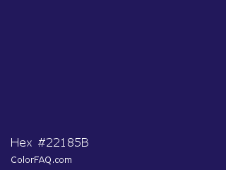 Hex #22185b Color is a dark indigo color and the nearest color is Violent Violet #290c5e. Hex code #22185b and RGB value is rgb(34,24,91). In RGB color space, this color is composed of 13% red, 9% green, 36% blue, In CMYK color space, this color is composed of 63% cyan, 74% magenta, 0% yellow , 64% black , In HSL color space, this color has a hue angle of 249° , 58% saturation and 23% lightness.