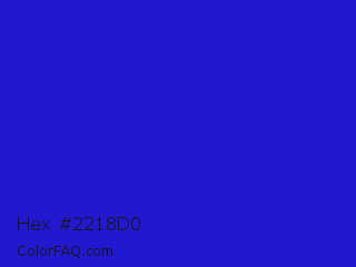Hex #2218d0 Color is a normal indigo color and the nearest color is Interdimensional Blue #360ccc. Hex code #2218d0 and RGB value is rgb(34,24,208). In RGB color space, this color is composed of 13% red, 9% green, 82% blue, In CMYK color space, this color is composed of 84% cyan, 88% magenta, 0% yellow , 18% black , In HSL color space, this color has a hue angle of 243° , 79% saturation and 45% lightness.