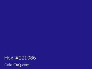 Hex #221986 Color is a normal indigo color and the nearest color is Jacksons Purple #20208d. Hex code #221986 and RGB value is rgb(34,25,134). In RGB color space, this color is composed of 13% red, 10% green, 53% blue, In CMYK color space, this color is composed of 75% cyan, 81% magenta, 0% yellow , 47% black , In HSL color space, this color has a hue angle of 245° , 69% saturation and 31% lightness.