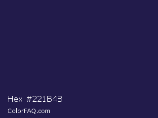 Hex #221b4b Color is a very dark indigo color and the nearest color is Port Gore #251f4f. Hex code #221b4b and RGB value is rgb(34,27,75). In RGB color space, this color is composed of 13% red, 11% green, 29% blue, In CMYK color space, this color is composed of 55% cyan, 64% magenta, 0% yellow , 71% black , In HSL color space, this color has a hue angle of 249° , 47% saturation and 20% lightness.