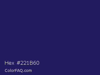 Hex #221b60 Color is a dark indigo color and the nearest color is Lucky Point #1a1a68. Hex code #221b60 and RGB value is rgb(34,27,96). In RGB color space, this color is composed of 13% red, 11% green, 38% blue, In CMYK color space, this color is composed of 65% cyan, 72% magenta, 0% yellow , 62% black , In HSL color space, this color has a hue angle of 246° , 56% saturation and 24% lightness.
