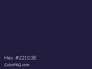 Hex #221d3e Color is a very dark indigo color and the nearest color is Steel Gray #262335. Hex code #221d3e and RGB value is rgb(34,29,62). In RGB color space, this color is composed of 13% red, 11% green, 24% blue, In CMYK color space, this color is composed of 45% cyan, 53% magenta, 0% yellow , 76% black , In HSL color space, this color has a hue angle of 249° , 36% saturation and 18% lightness.