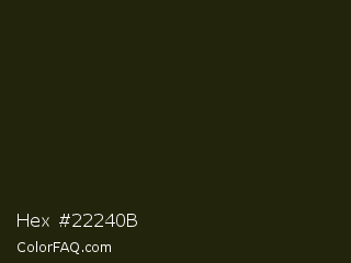 Hex #22240b Color is a almost black yellow color and the nearest color is Eternity #211a0e. Hex code #22240b and RGB value is rgb(34,36,11). In RGB color space, this color is composed of 13% red, 14% green, 4% blue, In CMYK color space, this color is composed of 6% cyan, 0% magenta, 69% yellow , 86% black , In HSL color space, this color has a hue angle of 65° , 53% saturation and 9% lightness.
