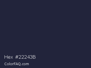Hex #22243b Color is a very dark blue color and the nearest color is Ebony Clay #26283b. Hex code #22243b and RGB value is rgb(34,36,59). In RGB color space, this color is composed of 13% red, 14% green, 23% blue, In CMYK color space, this color is composed of 42% cyan, 39% magenta, 0% yellow , 77% black , In HSL color space, this color has a hue angle of 235° , 27% saturation and 18% lightness.