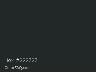 Hex #222727 Color is a very dark cyan color and the nearest color is Dark Gunmetal #1f262a. Hex code #222727 and RGB value is rgb(34,39,39). In RGB color space, this color is composed of 13% red, 15% green, 15% blue, In CMYK color space, this color is composed of 13% cyan, 0% magenta, 0% yellow , 85% black , In HSL color space, this color has a hue angle of 180° , 7% saturation and 14% lightness.