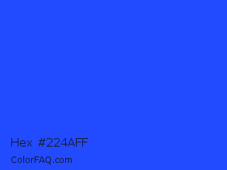 Hex #224aff Color is a normal blue color and the nearest color is Blue RYB #0247fe. Hex code #224aff and RGB value is rgb(34,74,255). In RGB color space, this color is composed of 13% red, 29% green, 100% blue, In CMYK color space, this color is composed of 87% cyan, 71% magenta, 0% yellow , 0% black , In HSL color space, this color has a hue angle of 229° , 100% saturation and 57% lightness.