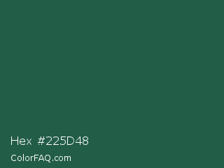 Hex #225d48 Color is a dark green color and the nearest color is Green Pea #1d6142. Hex code #225d48 and RGB value is rgb(34,93,72). In RGB color space, this color is composed of 13% red, 36% green, 28% blue, In CMYK color space, this color is composed of 63% cyan, 0% magenta, 23% yellow , 64% black , In HSL color space, this color has a hue angle of 159° , 46% saturation and 25% lightness.